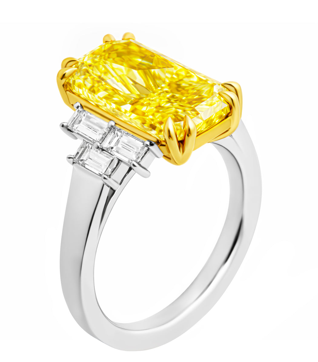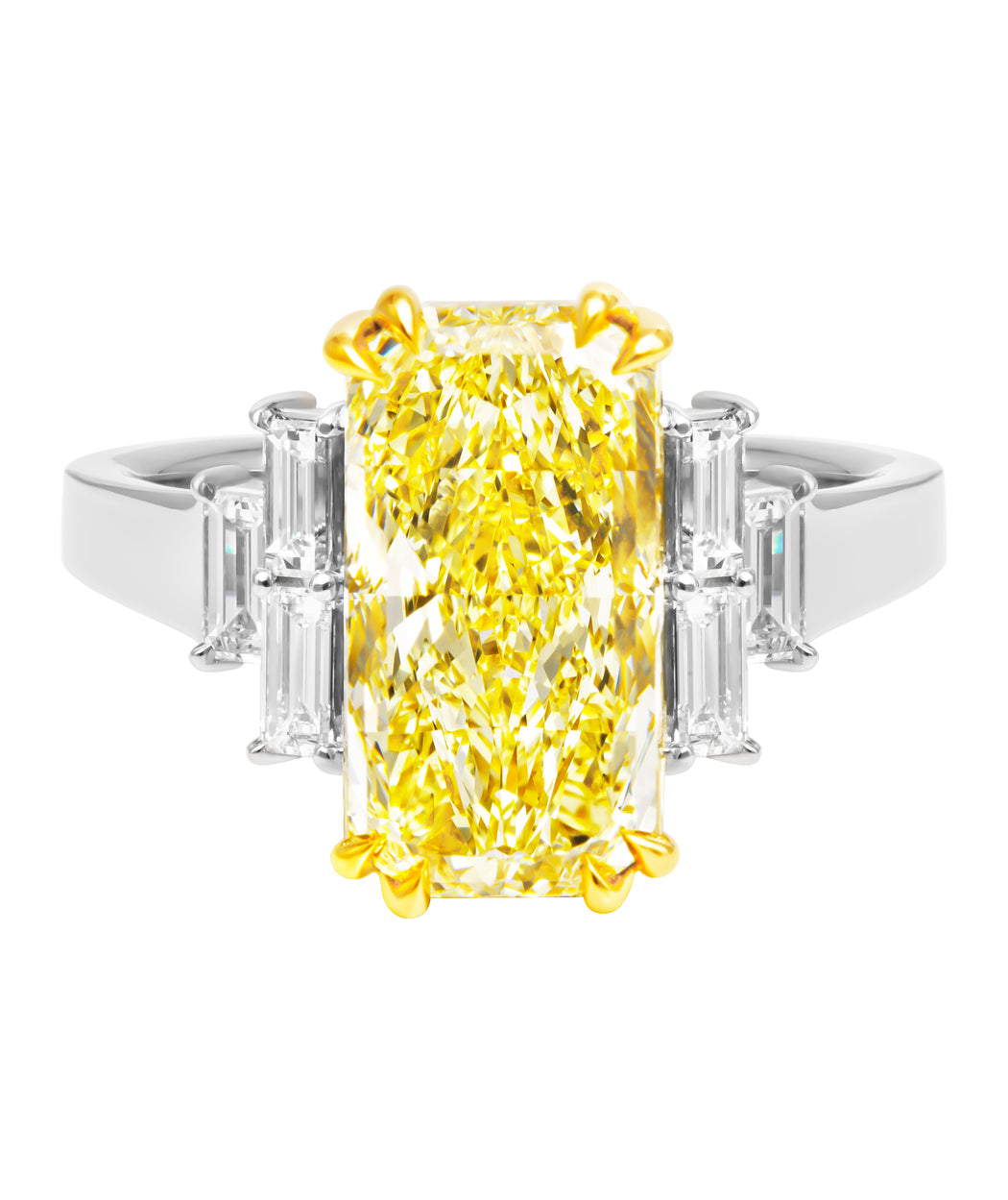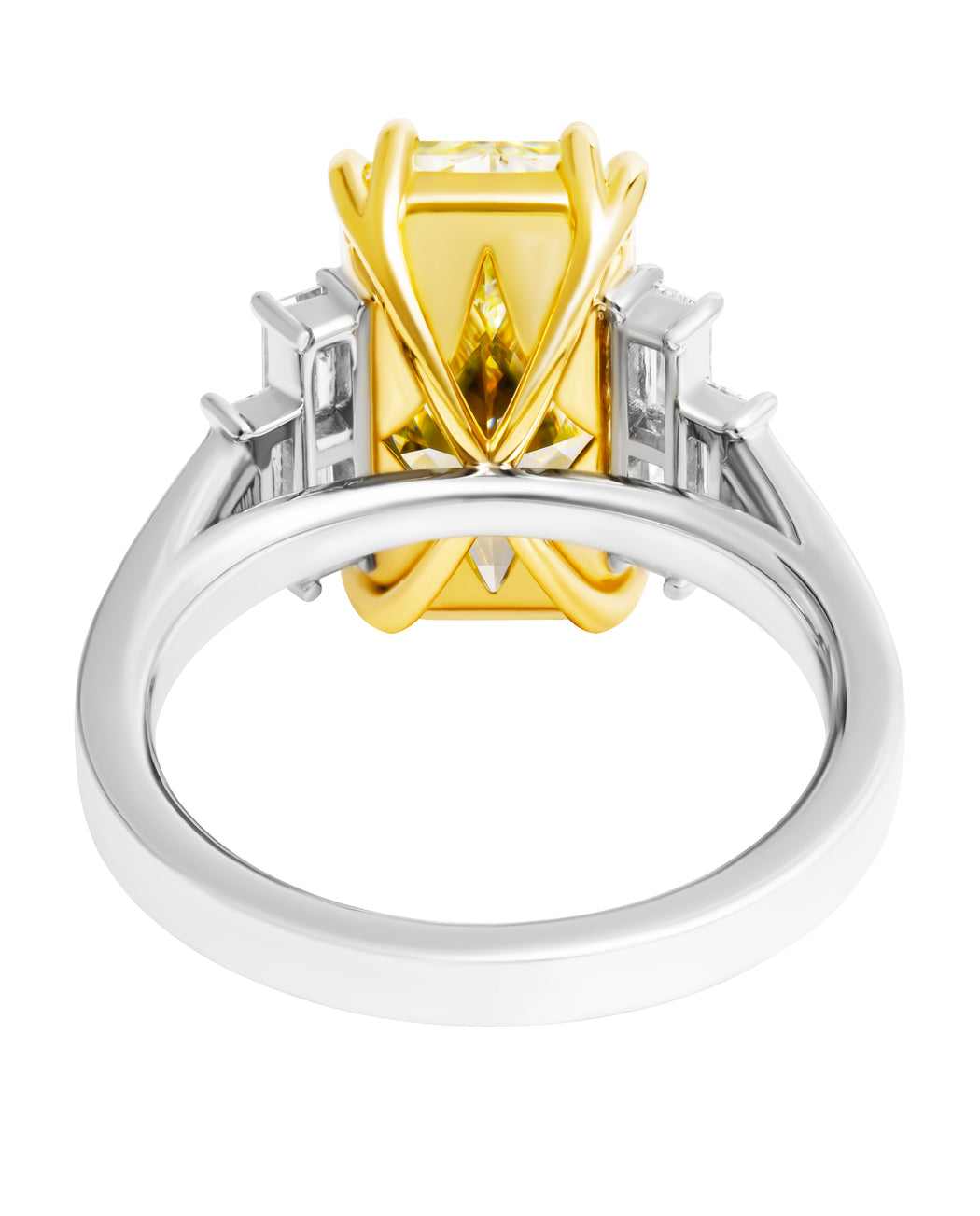 The centerpiece of this extraordinary ring is a magnificent 5.00-carat Natural Fancy Light Yellow Even VS2 Radiant Shape Diamond, certified by the prestigious Gemological Institute of America (GIA) with certification number GIA#5222993398. The radiant cut of the diamond enhances its brilliance, while the captivating fancy light yellow hue adds a touch of warmth and uniqueness to this already remarkable piece. The diamond's exceptional clarity (VS2) ensures a mesmerizing play of light, creating an enchanting visual spectacle.