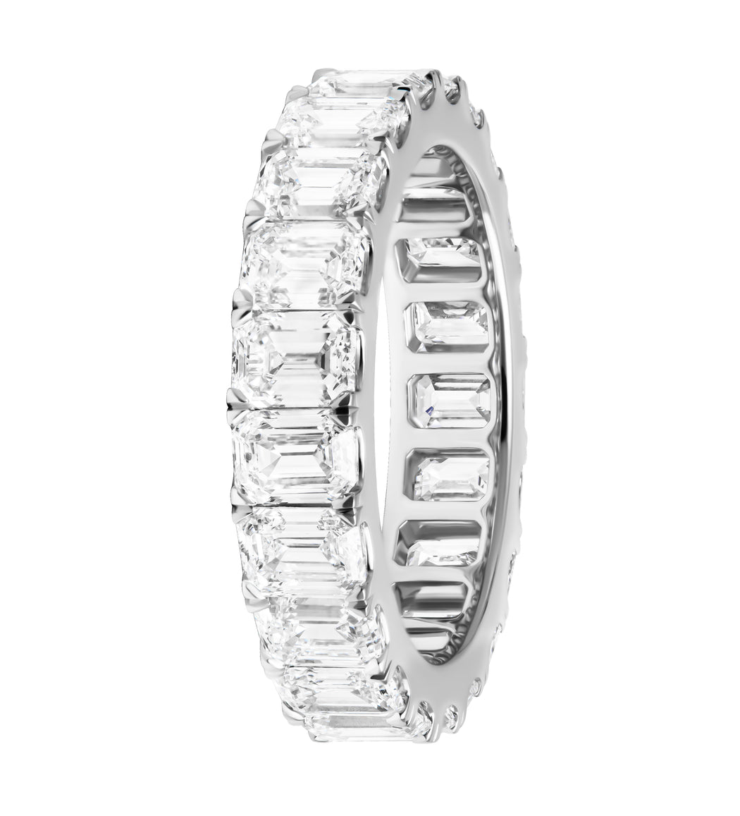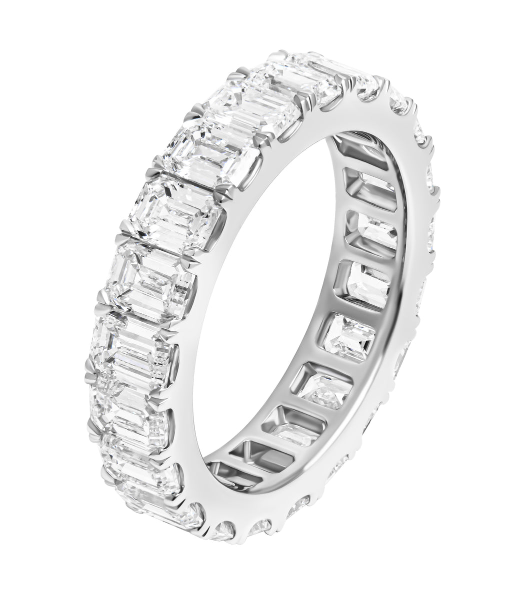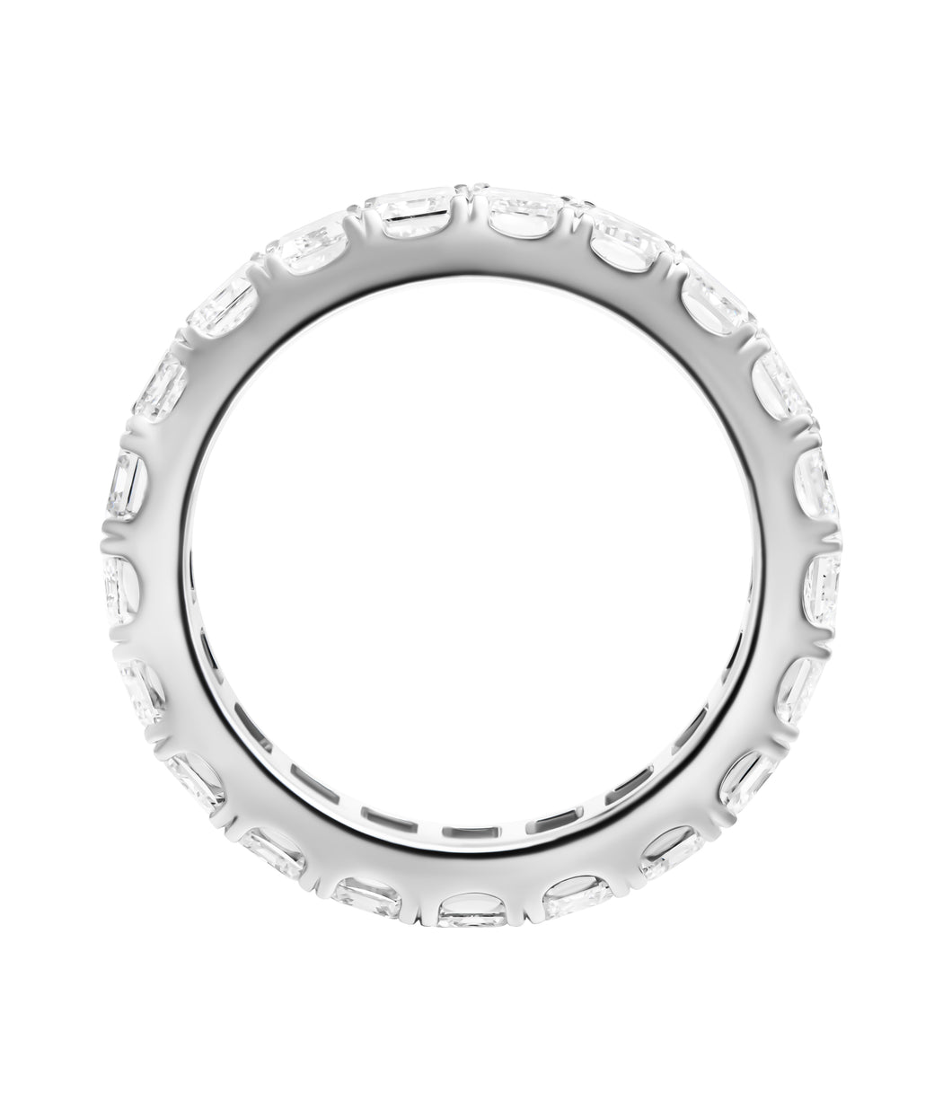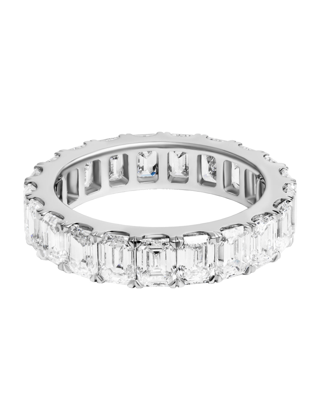 A timeless platinum wedding band featuring 21 lab-grown emerald-cut diamonds with a total weight of 5.00 carats. Each stone is precisely set to create a continuous line of brilliance and refined elegance. Ring size 6.